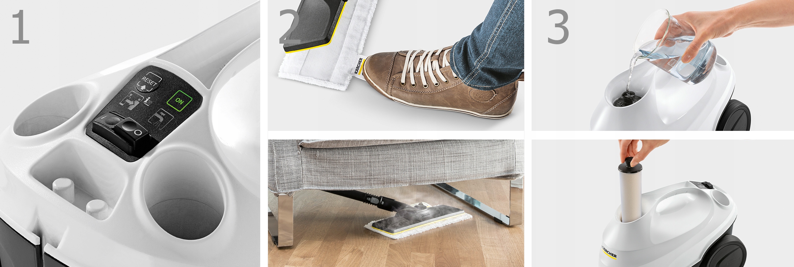 Отпариватель Karcher SC 3 EASYFIX отлично работает. на всех водонепроницаемых поверхностях. SC3 очищает плитку на стенах, санузлах, полах и душевых кабинах, кухонных столешницах, духовках, зеркалах, радиаторах, вытяжках и мелких элементах, таких как линии затирки или фурнитуру. Идеально подходит для быстрой и легкой очистки углов, кромок и других труднодоступных мест.