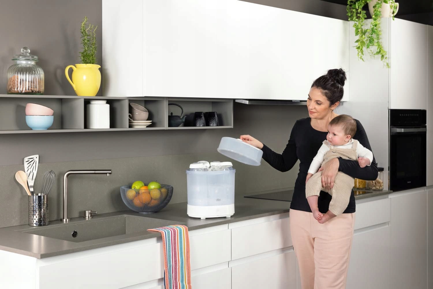 - Паровой стерилизатор: Стерилизатор Chicco SterilNatural 3-в-1 дезинфицирует детские бутылочки, молокоотсосы и пустышки в домашних условиях. всего 5 минут (без времени на разогрев) естественным паром, без необходимости добавления каких-либо химических добавок.