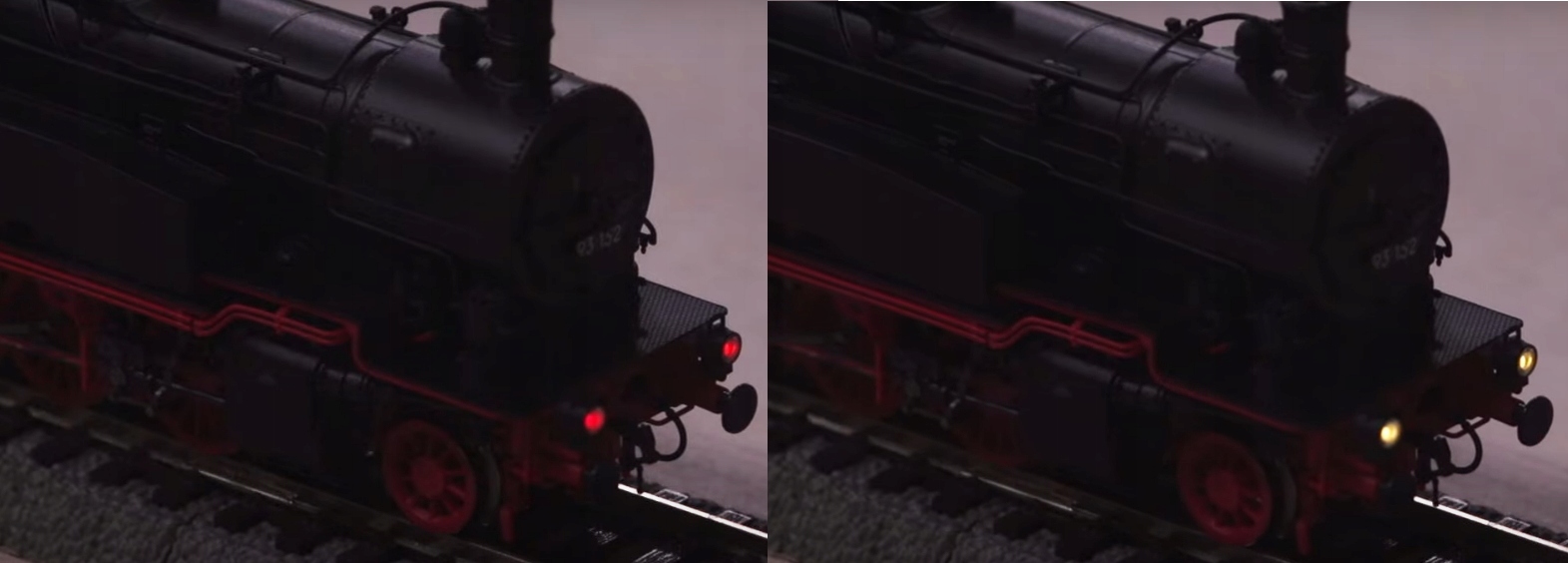 - Освещение локомотивов: Миниатюрный LED - два белых фонаря спереди и два красных фонаря сзади, изменяемые в зависимости от направления движения и освещения камина; ли> ul>