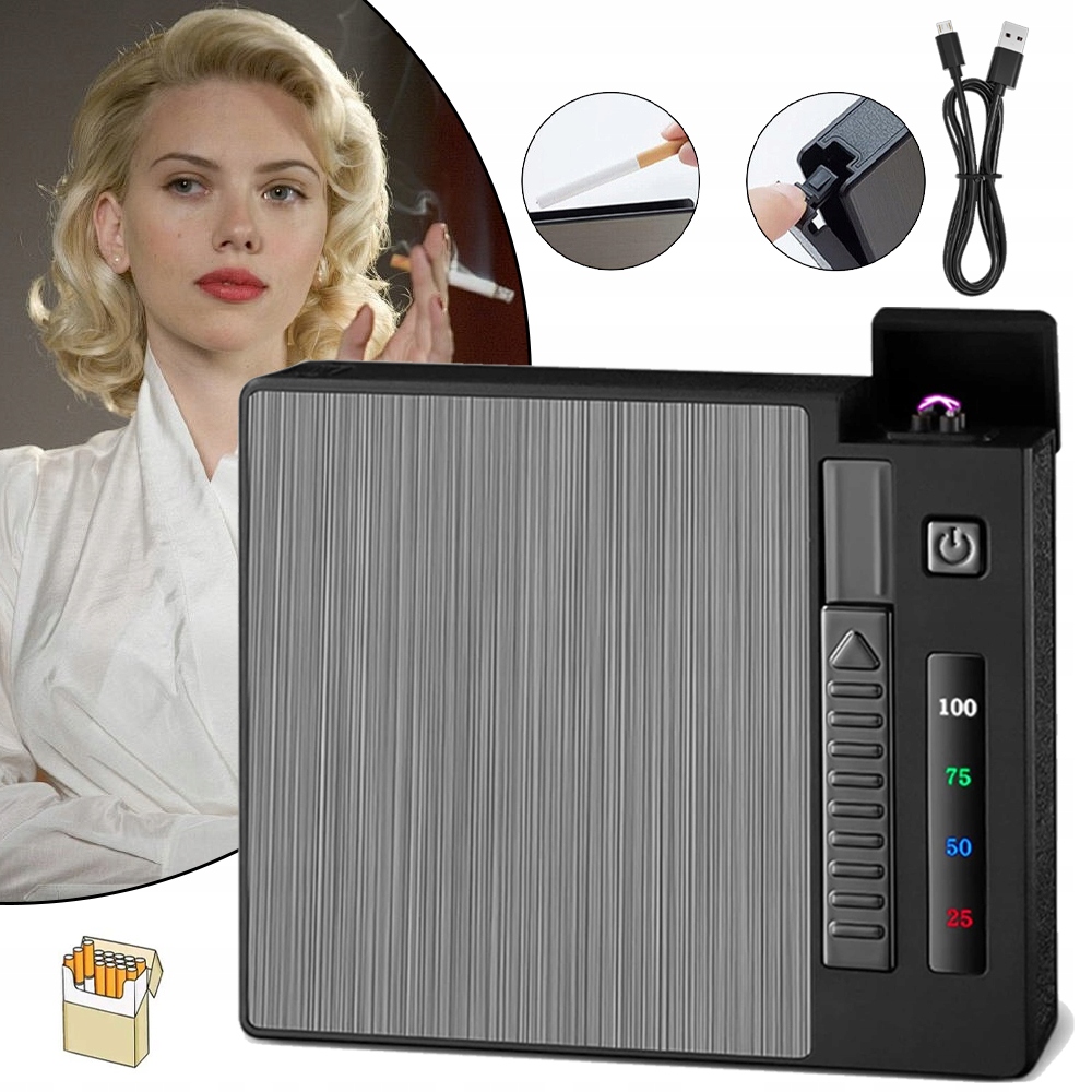 🚬【Легко носить с собой】Прикуриватель вмещает до 20 сигарет (в зависимости от размера сигарет) . Этот портсигар с зажигалкой. Клапан позволяет легко открывать и закрывать коробку.