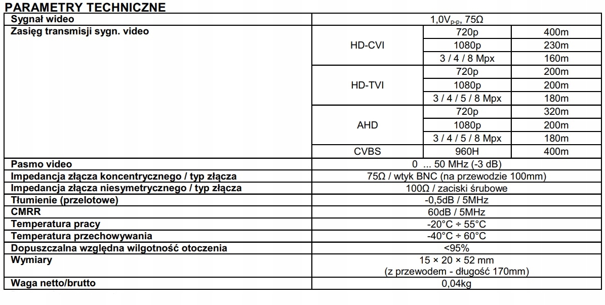 ПАСИВНИЙ ВІДЕО ТРАНСФОРМАТОР З КАБЕЛЕМ UTP BNC CCTV