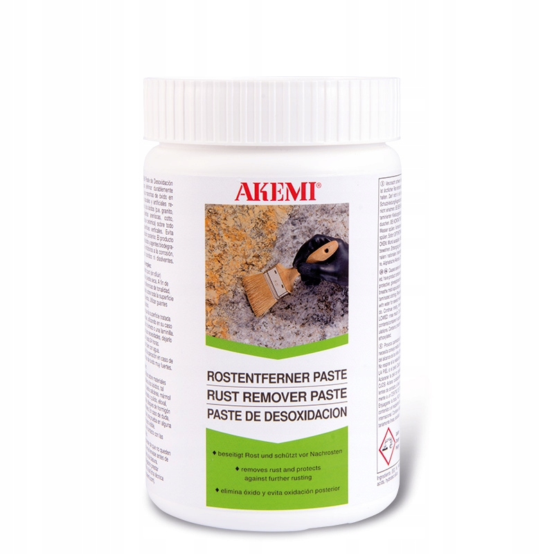 AKEMI® Rust Remover Paste — профессиональное, интенсивное чистящее средство на основе неорганических кислот с неионогенными ПАВ и ингибиторами ржавчины. Продукт не содержит соляной кислоты. Содержащиеся поверхностно-активные вещества биоразлагаемы в соответствии с законодательными нормами, касающимися поверхностно-активных веществ. AKEMI® Rust Remover подходит для удаления поверхностных пятен ржавчины, а также пятен ржавчины, возникающих в результате ржавчины на кислотоупорном природном и искусственном камне. Налеты на природном камне (граните, гнейсе), вызывающие ржавчину, покрываются, что препятствует образованию новой ржавчины. Паста AKEMI® Rust Remover Paste идеально подходит для напольных покрытий.