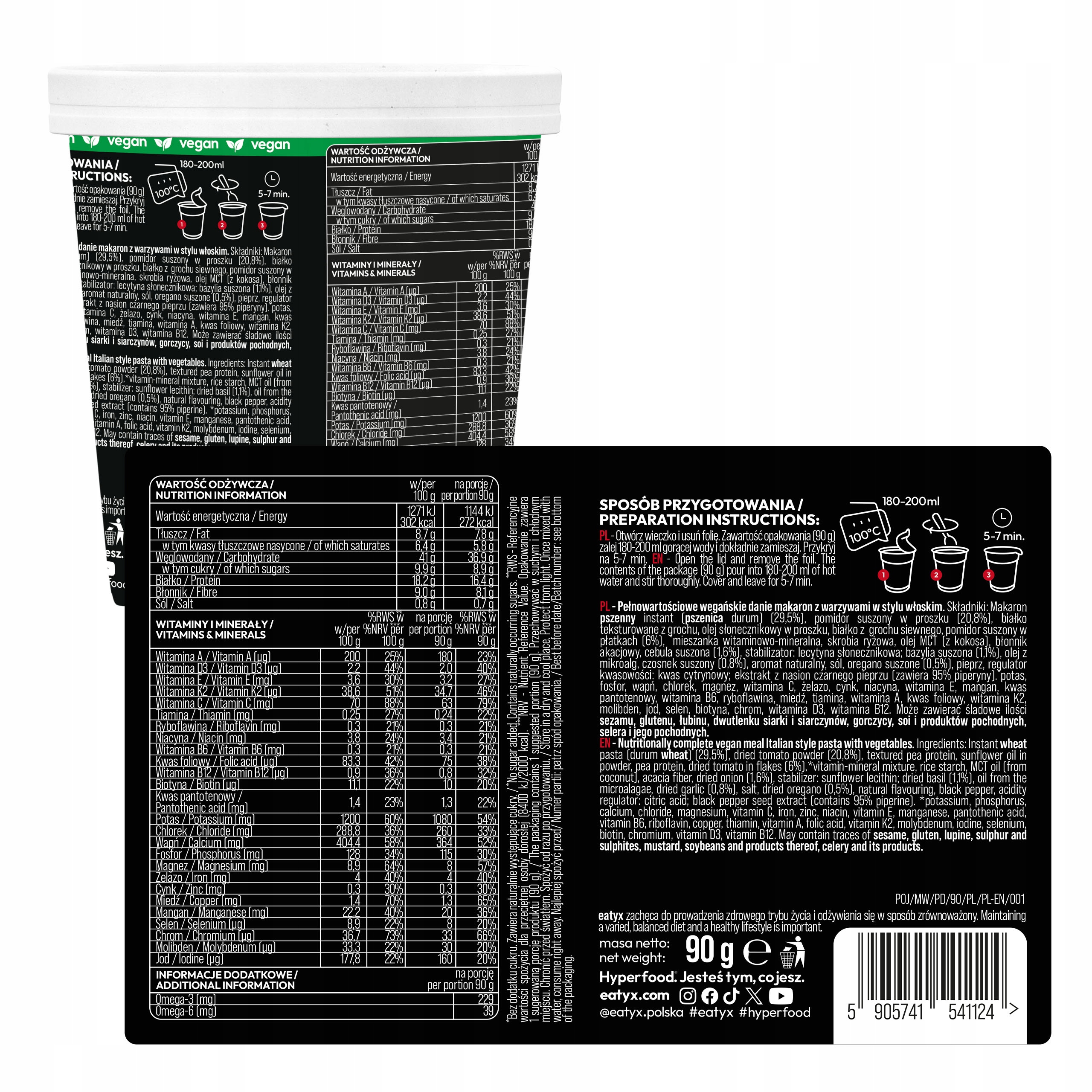 ➡️ Полноценный обед итальянская паста eatyx в новой, удобной чашке! Идеально подходит для тех, кто ценит здоровое, растительное и быстрое питание без компромиссов. Благодаря этому инновационному решению вы сможете наслаждаться питательным блюдом, где бы вы ни находились – просто налейте в чашку кипяток и подождите несколько минут. Он помогает вам заботиться о своей фигуре, контролировать свой вес и количество потребляемых калорий. Продукт содержит тщательно отобранные ингредиенты, обогащенные 26 витаминами и минералами, жирными кислотами омега 3–6, кокосовым маслом MTC, клетчаткой и белком. Идеальные пропорции ингредиентов и оптимальная калорийность делают eatyx отличным выбором для здорового питания.