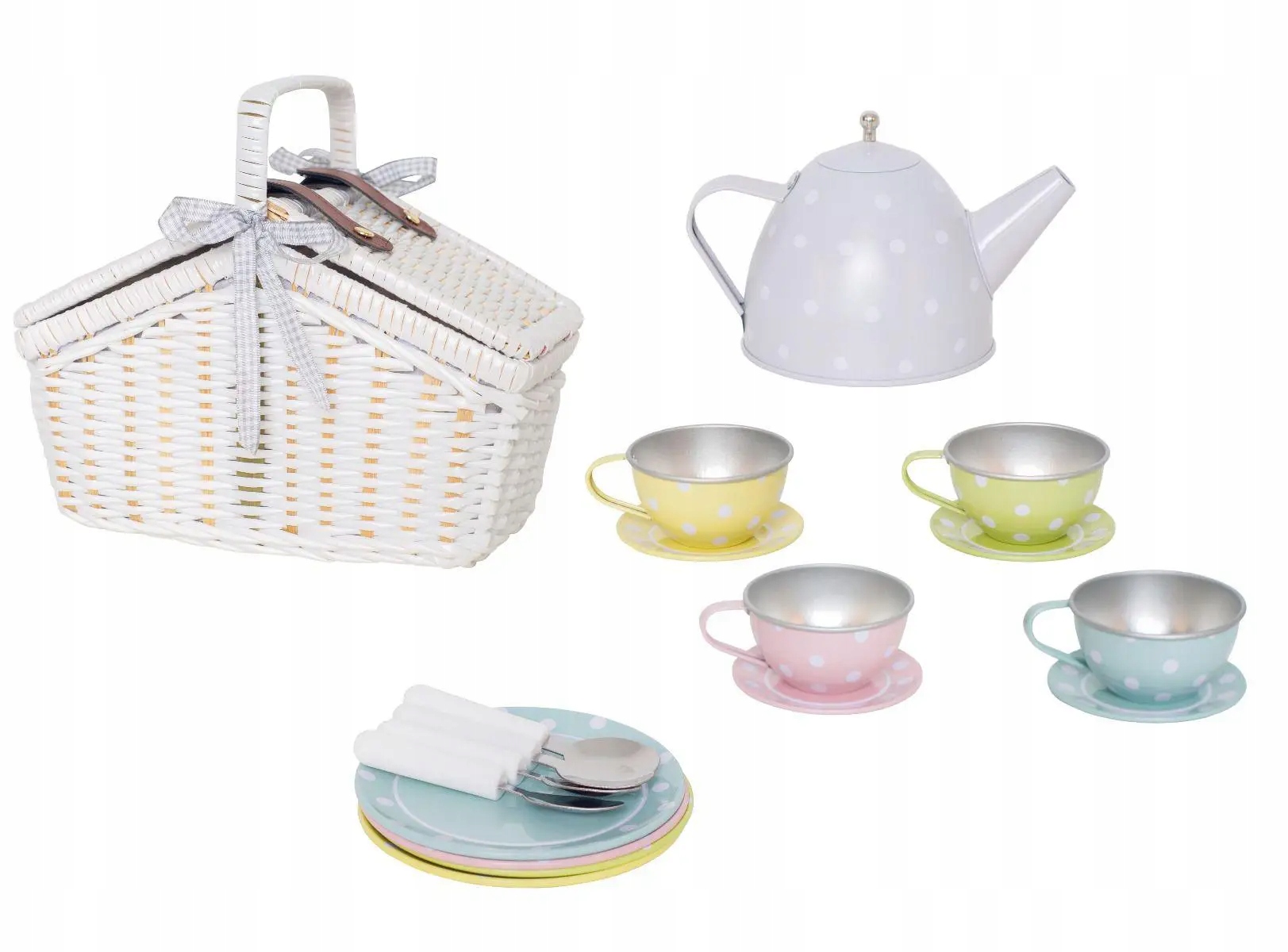 Белая корзина с красной лентой и сервиз пастельных тонов серого, желтого, синего, зеленого, розового с белыми точками, изготовлены из прочного листового металла. В комплект входят: