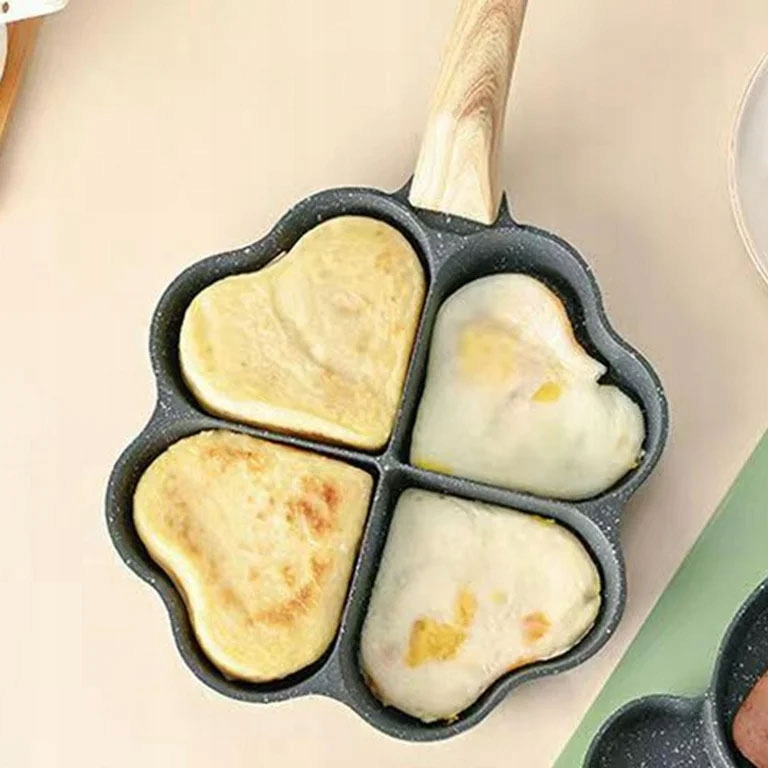 Сковорода с разделенными зонами в форме сердца для одновременного приготовления нескольких закусок. Имеет 4 отверстия для приготовления яичницы, блинов или оладий. Одна универсальная сковорода позволит вам приготовить целый завтрак в одной кастрюле, сэкономив время и сократив мытье посуды.