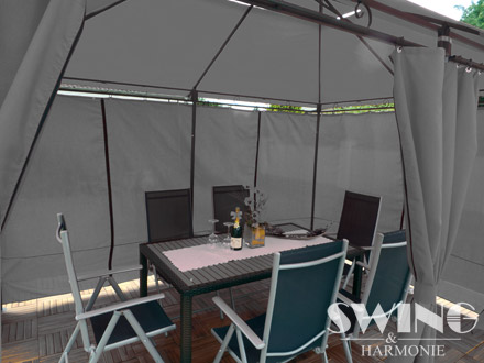 Благодаря боковым стенкам, застегивающимся на молнию, нам не будет страшен ветер и дождь. Москитные сетки на молнии обеспечивают защиту от надоедливых насекомых. Павильон украшен авторским орнаментом, что придает павильону неповторимый шарм.