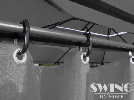 Каркас украшен металлическими украшениями и шторами со скользящей по каркасу москитной сеткой