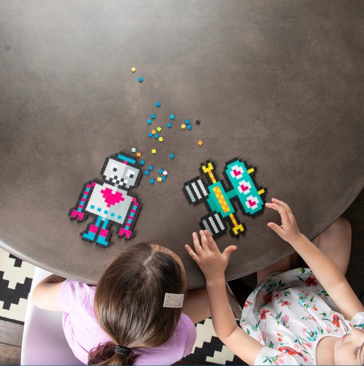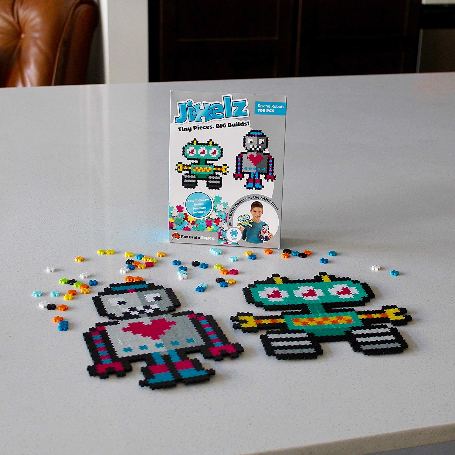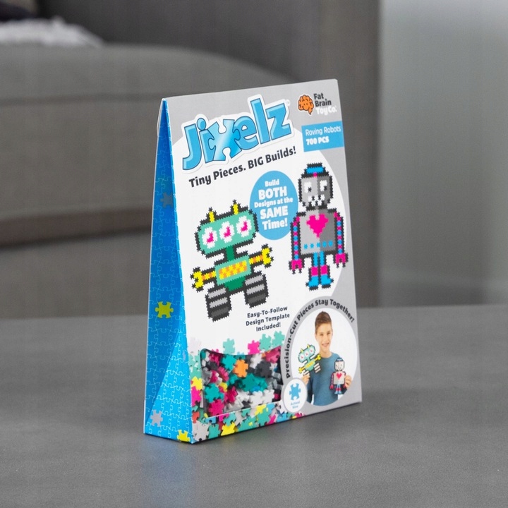 Jixelz включает в себя 700 красочных, аккуратно вырезанных крошечных пластиковых пазлов, из которых можно собрать двух разных роботов.
