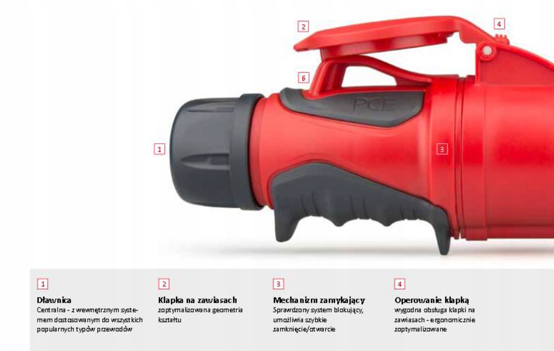 покрытая поверхность, обеспечивающая большую безопасность и превосходную адгезию для всех применений, совместимая со стандартизированными продуктами различных производителей CEE, винтовые зажимы легко доступны и открыты, проверенная система блокировки обеспечивает быстрое закрытие/отверстие, кран с внутренней системой, адаптированной ко всем популярным типам кабелей, эргономично удерживаемой для всех применений