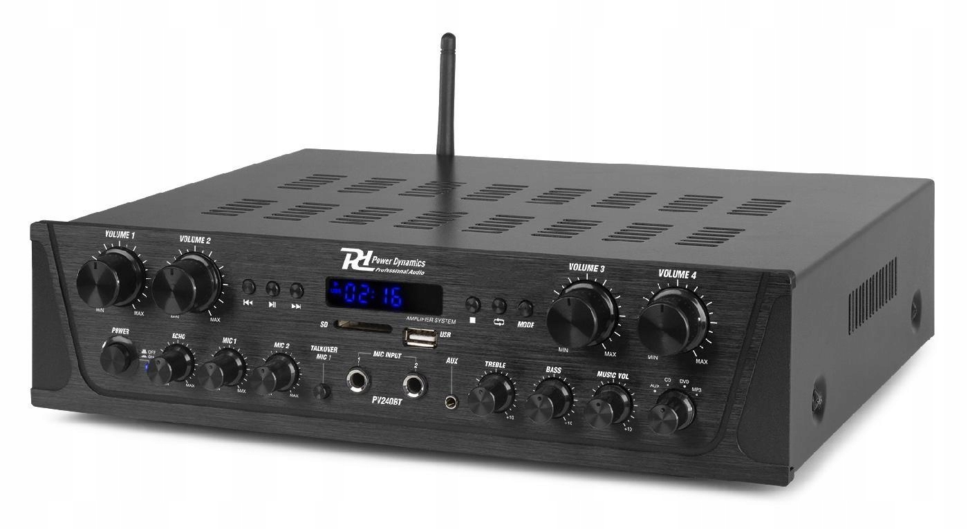 Серия PV2 — это серия интеллектуальных многоканальных стереоусилителей с напряжением 100 В, оснащенных передовой беспроводной технологией 4.2 BT и работающих со всеми новейшими устройствами, включая смартфоны, планшеты, ноутбуки и компьютеры. Все системы предлагают возможность отправлять музыку или объявления на различные желаемые каналы (мультирум) с регулировкой громкости для каждого канала. Этот усилитель, оснащенный разъемом USB/SD для воспроизведения файлов MP3/WMA, FM-радио со светодиодным дисплеем и двумя микрофонными входами с регулировкой высоких/низких частот, подходит для использования дома или в офисе.