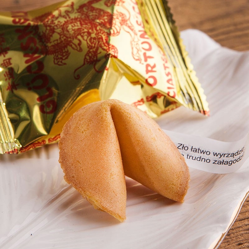 - ингредиенты: 10 песочных печений с состоянием внутри (на польском и английском языках); печенье имеет вкус песочного бисквита; гадания помещаются внутрь на листе бумаги – это изречения, цитаты и позитивные предсказания на будущее; точный состав указан на упаковке.