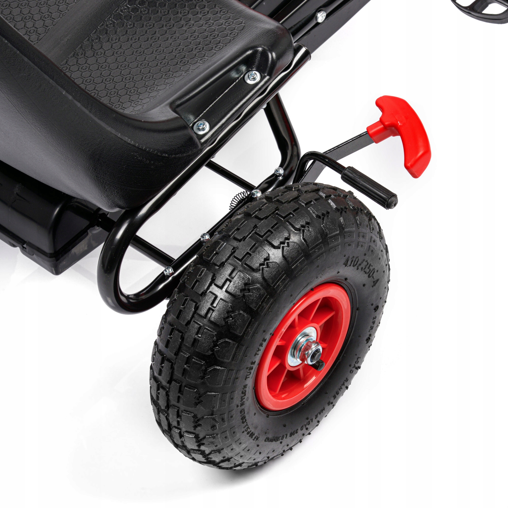 Стальная каркасная структура , оснащенная педалями и армированным рулевым колесом, позволяет двигаться вперед и назад. Механизм привода цепи состоит из полного цепного корпуса и металлических передач, способствующих эффективному управлению транспортным средством и его приводом. Gokart также имеет возможность свободного бега - полезно в более сложных условиях полевых условий, например, Во время поездки вниз. Ручной тормоз еще больше повышает безопасность и удобство использования.