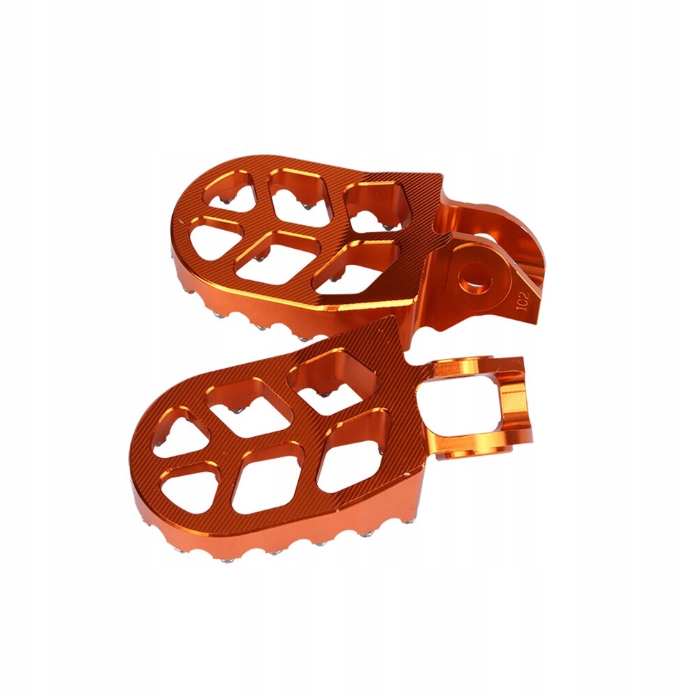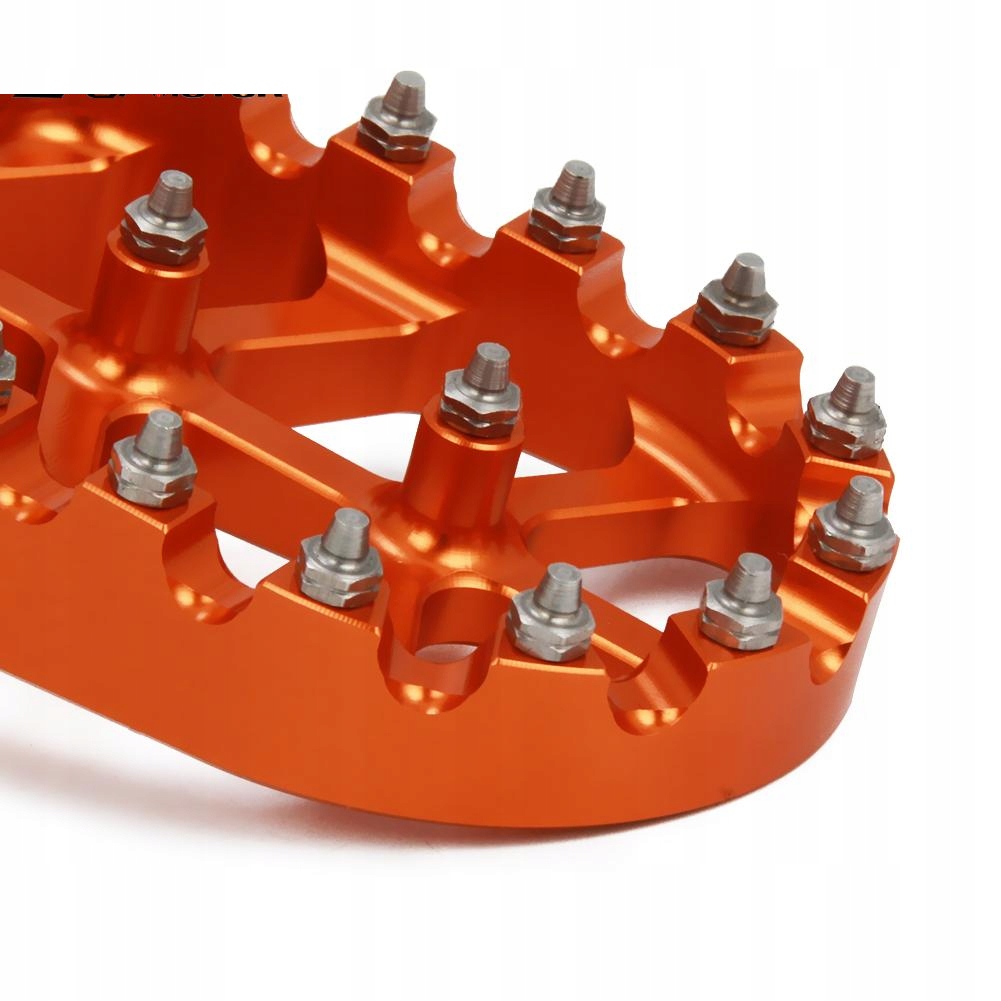 Подножки изготовлены из кованого алюминия Т7 7075, одного из самых прочных сплавов. Это обеспечивает малый вес при сохранении оптимальной прочности. Большая поверхность контакта с колодкой и конструкция шипов обеспечивают адекватное сцепление в любых условиях. Они шире стандартных – большая поверхность контакта подошвы с подставкой для ног, а также острые и сменные зубцы увеличивают сцепление обуви, делая мотоцикл более надежным и устойчивым. Острые зубья изготовлены из закаленной стали и устойчивы к истиранию. Они съемные и заменяемые.