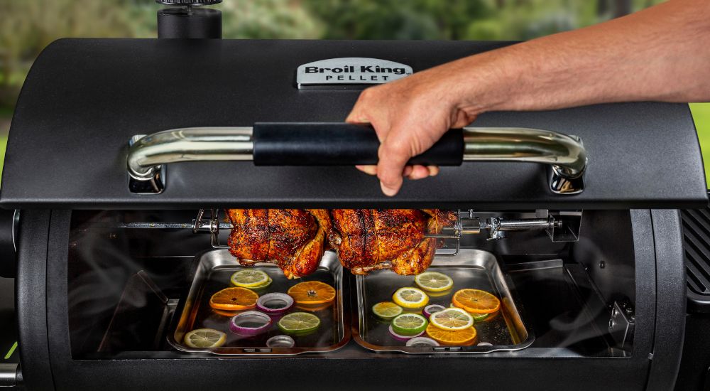 Regal Pellet поставляется с вращающейся вертелом. Это позволяет переворачивать большие куски мяса при их запекании. Почему это имеет значение? Постоянно переворачивая мясо во время запекания, вы получите супер сочные результаты!