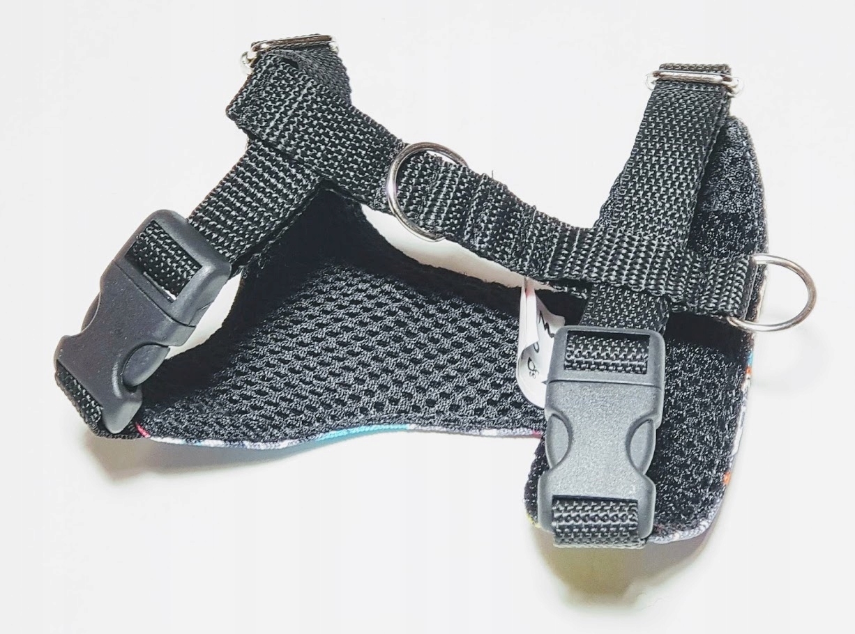 Шлейка имеет удобные застежки, так называемые пряжки, металлические регуляторы и металлические полукруги. .для крепления поводка.