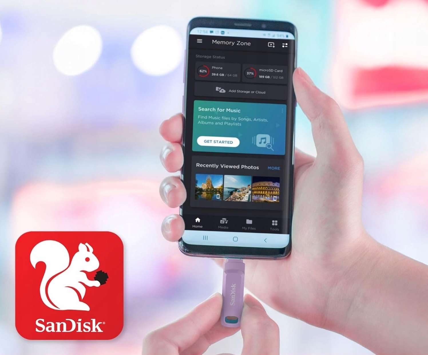 Автоматически создает резервные копии ваших последних фотографий, фильмов, музыки, документов и контактов, используя приложение Sandisk Memory Zone