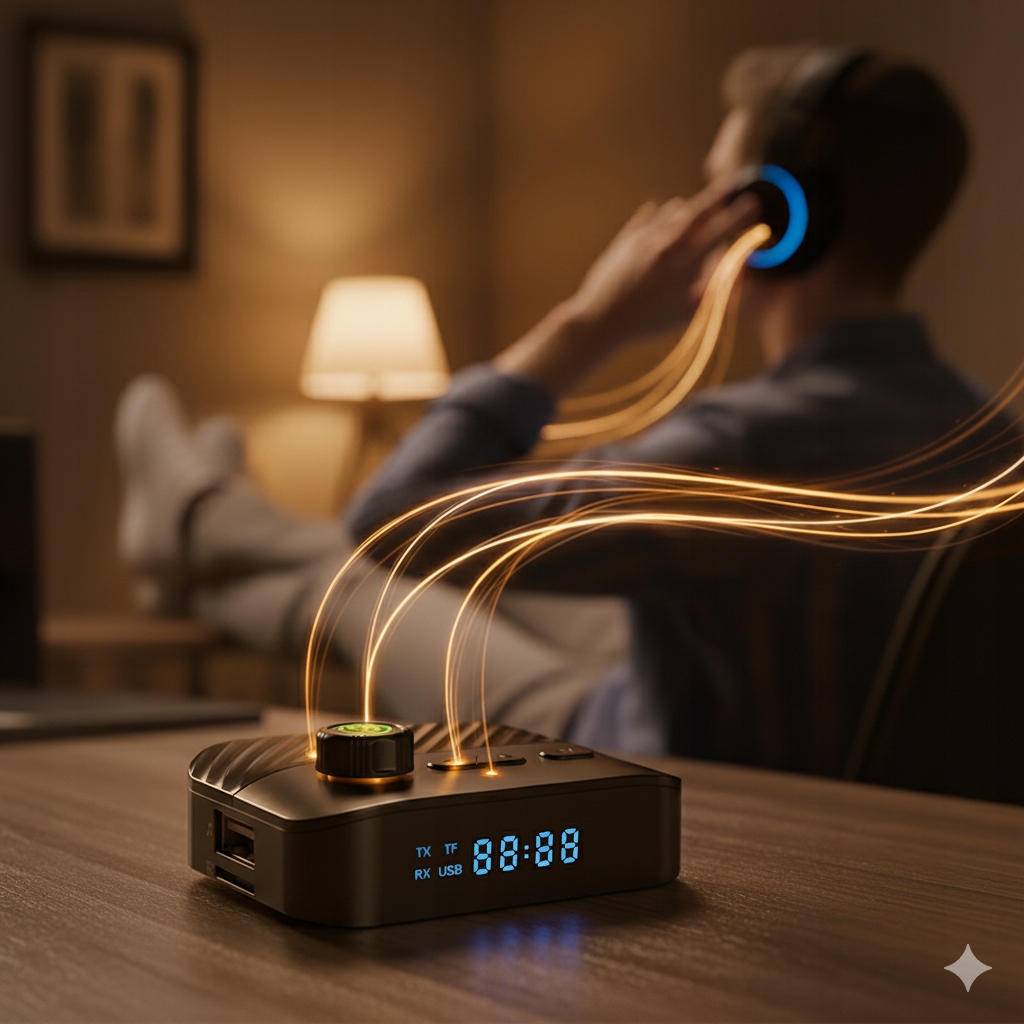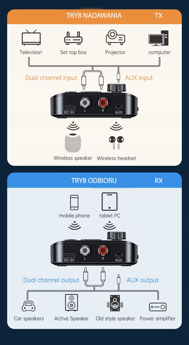 ✅ ✅ tx (TX): В этом режиме адаптер отправляет сигнал Bluetooth с устройств, которые не могут сделать это сами. Подключите его к телевизору, CD -плееру, игровой консоли или любому другому источнику звука, а затем соедините его с наушниками или динамиком Bluetooth. Благодаря этому вы сможете слушать свой любимый фильм ночью, не беспокоя других членов домохозяйства.