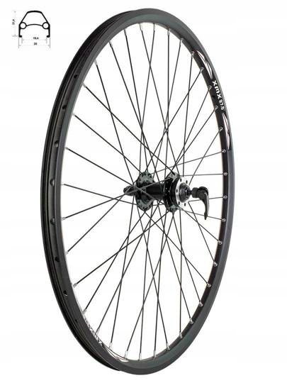 Прочное переднее велосипедное колесо диаметром 27,5 дюйма для дискового тормоза с 6 винтами. Алюминиевая ступица с картриджными подшипниками XMX-A291 с быстроразъемным механизмом. Заклепанный черный конический обод от XMX.