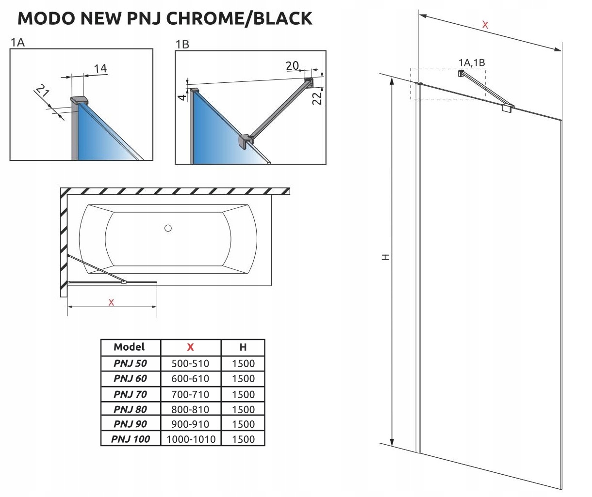 Цельная фиксированная шторка для ванны Modo New Black PNJ 80x150 из прозрачного стекла.