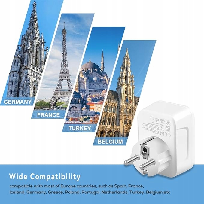 - Европейский дорожный адаптер: этот переходник с британско-европейской вилкой и USB-портами преобразует вашу британскую вилку (3-контактную). ) в Европу (2 круглых контакта), он широко совместим с Германией, Турцией, Францией, Испанией, Исландией, Нидерландами, Норвегией, Польшей, Португалией, Румынией, Венгрией, Австрией, Египтом, Финляндией, Грецией, Россией и почти всеми европейскими странами. . (Не подходит к розетке Type-C в Италии.)