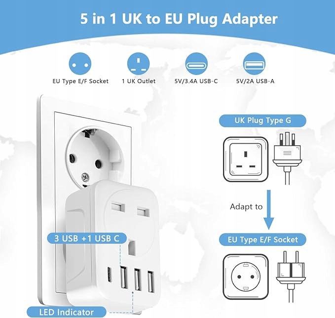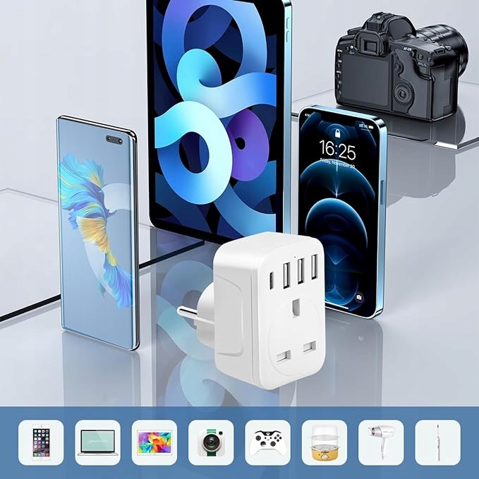 - Новое обновление адаптера для путешествий: этот адаптер из Великобритании в Европу подключается к 1 розетке переменного тока Великобритании и 4 портам USB (3 порта USB + 1 порт USB C), что позволяет заряжать 5 устройств одновременно. Идеально подходит для зарядки фотоаппарата, планшета, смартфона, бритвы, электрической зубной щетки, iPhone, Android, Samsung и других устройств во время путешествия.