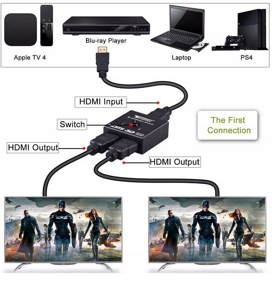 - ДВУНАПРАВЛЕННЫЙ ПЕРЕКЛЮЧАТЕЛЬ HDMI - Разветвитель HDMI 1 в 2 выхода / 2 в 1 может подключать два источника HDMI к одному дисплею HDMI или подключать один источник HDMI для переключения между двумя дисплеями (отображается только один монитор).
