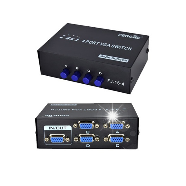 Switch VGA 4 x 1 -это продукт высокого качества, который позволяет подключать 4 компьютера к одному монитору или разделить сигнал VGA на 4 внешних приемника и просматривать изображение, а не одновременно на 4 мониторах.