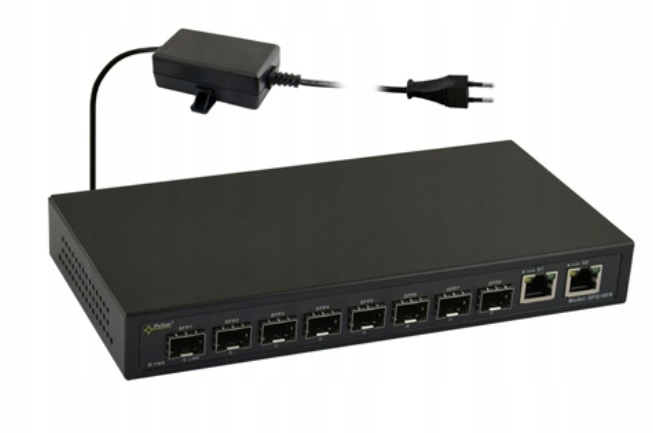 SWITCH PULSAR SFG10F8 — 10-портовый оптический коммутатор, предназначенный для передачи данных в сети Ethernet с использованием оптоволоконных кабелей и кабелей UTP. Коммутатор Cat 5e имеет восемь разъемов SFP (с маркировкой SFP1 ÷ SFP8), которые после использования оптоволоконного модуля (вставка GBIC) обеспечивают передачу по оптоволоконному кабелю.