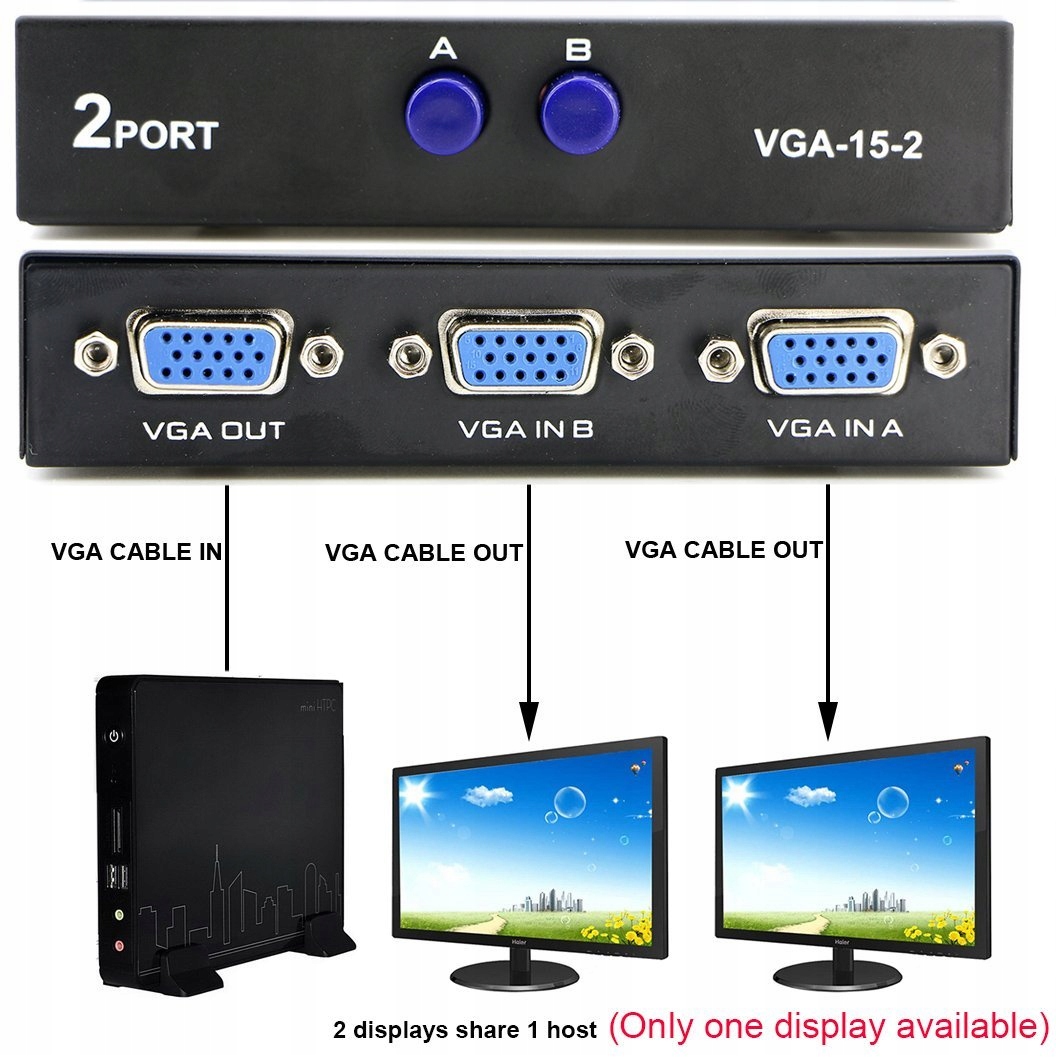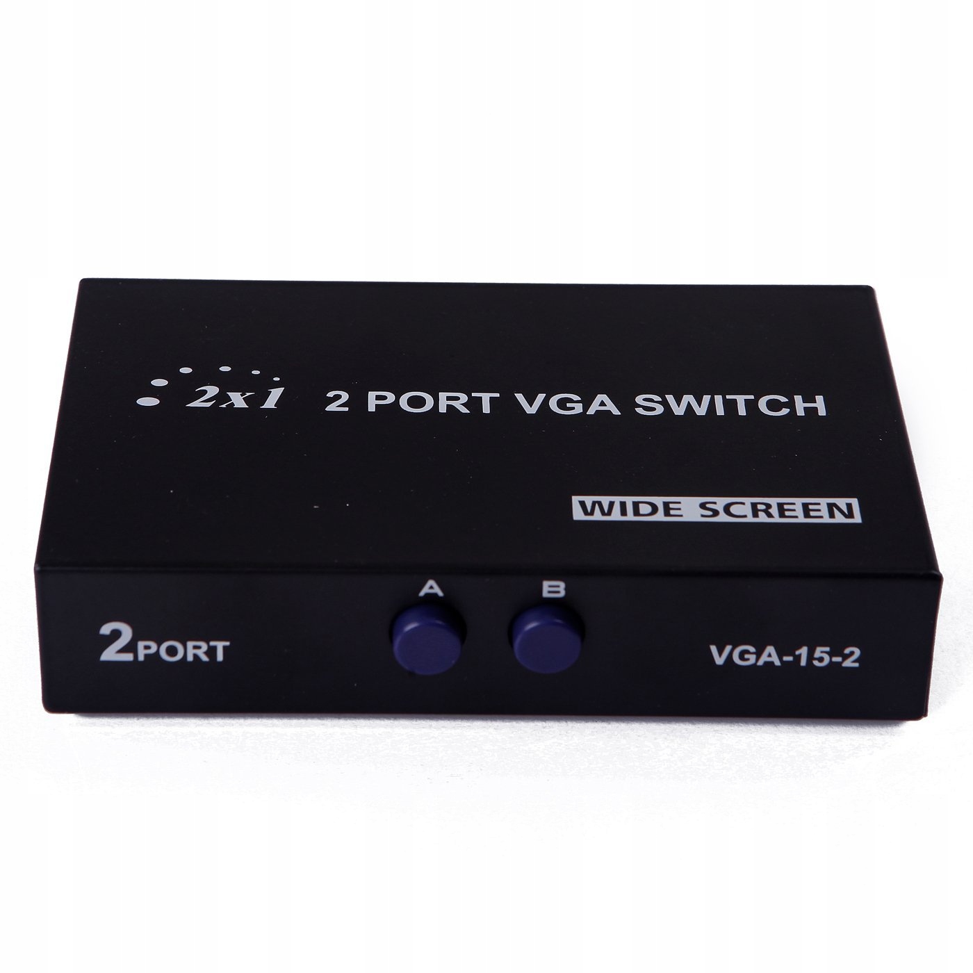 Switch VGA 2 x 1 – высококачественный продукт, позволяющий подключить 2 компьютера к одному монитору или разделить сигнал VGA на 2 внешних ресивера и просматривать изображение не одновременно на 2 мониторах.