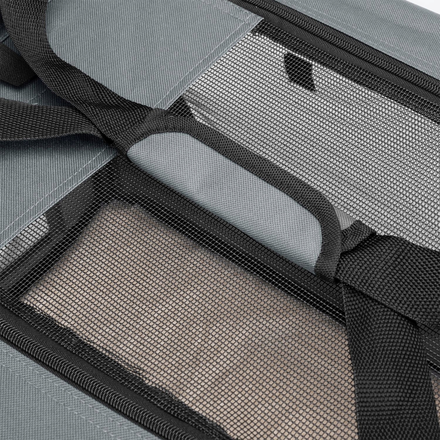 - Прочные ручки облегчают транспортировку домашнего животного. Небольшой внешний карман, прикрепленный к верхней части клетки собаки, также предлагает место для небольших игрушек, воротников или угощений. Молнии безопасно закрывает сумку от голодных гурметов.