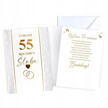 Открытки Мечты "К 55-летию свадьбы" Открытка DK-1344 B6 из декоративной серии Dream Cards - небольшая, но впечатляющая благодаря привлекательным цветам и интересному декору. Это идеальный выбор, сочетающий в себе демократичную цену и качество. Особенности: размер: В6, 16,6 х 11,7 см в сложенном виде, конверт: в комплекте, красочный, украшения: красочные, разнообразные, богатые (в зависимости от рисунка: наклеенные украшения, элементы украшений, разделители, металлизированная фольга, тиснение и т.д.), повод: Юбилей