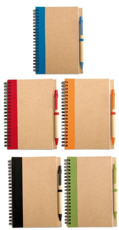 Блокнот с 70 чистыми листами переработанной бумаги и шариковой ручкой с синим стержнем.