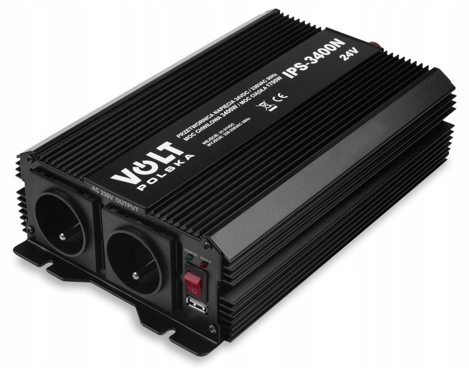 Электронный преобразователь напряжения IPS 3400N 24V 1 x USB используется для подачи электрических устройств, требующих чередующегося напряжения 230 В из батарей и автомобильных установок с напряжением постоянного напряжения 24 В.