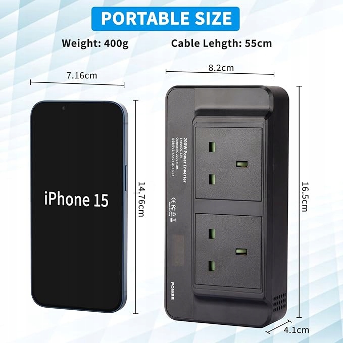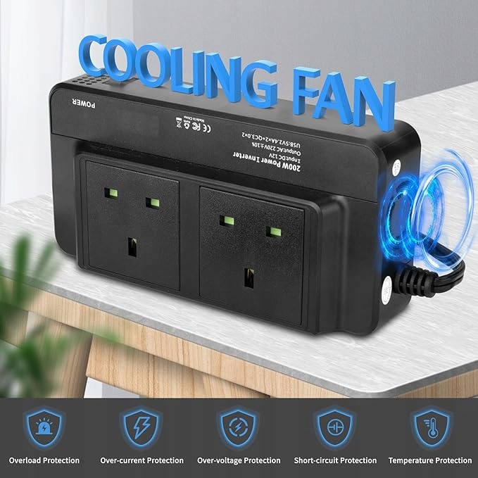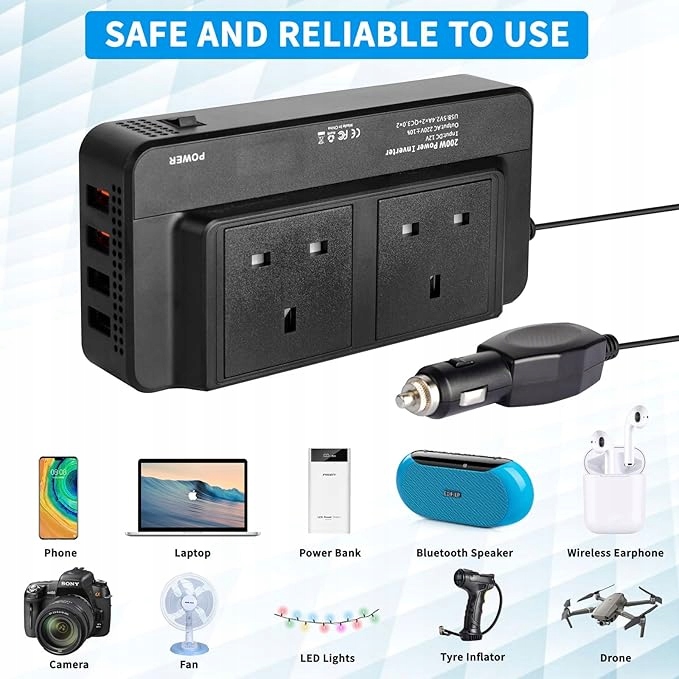 ИНВЕРТОР 12 В 240 В. Обеспечивая непрерывное преобразование постоянного тока в переменный ток 200 Вт и пиковую выходную мощность 220 Вт, оснащенный 2 розетками переменного тока и 4 портами USB для зарядки (2 порта зарядки USB-A на 2,4 А и 2 порта быстрой зарядки USB-QC3.0), этот автомобильный инвертор может одновременно питать до 6 устройств.