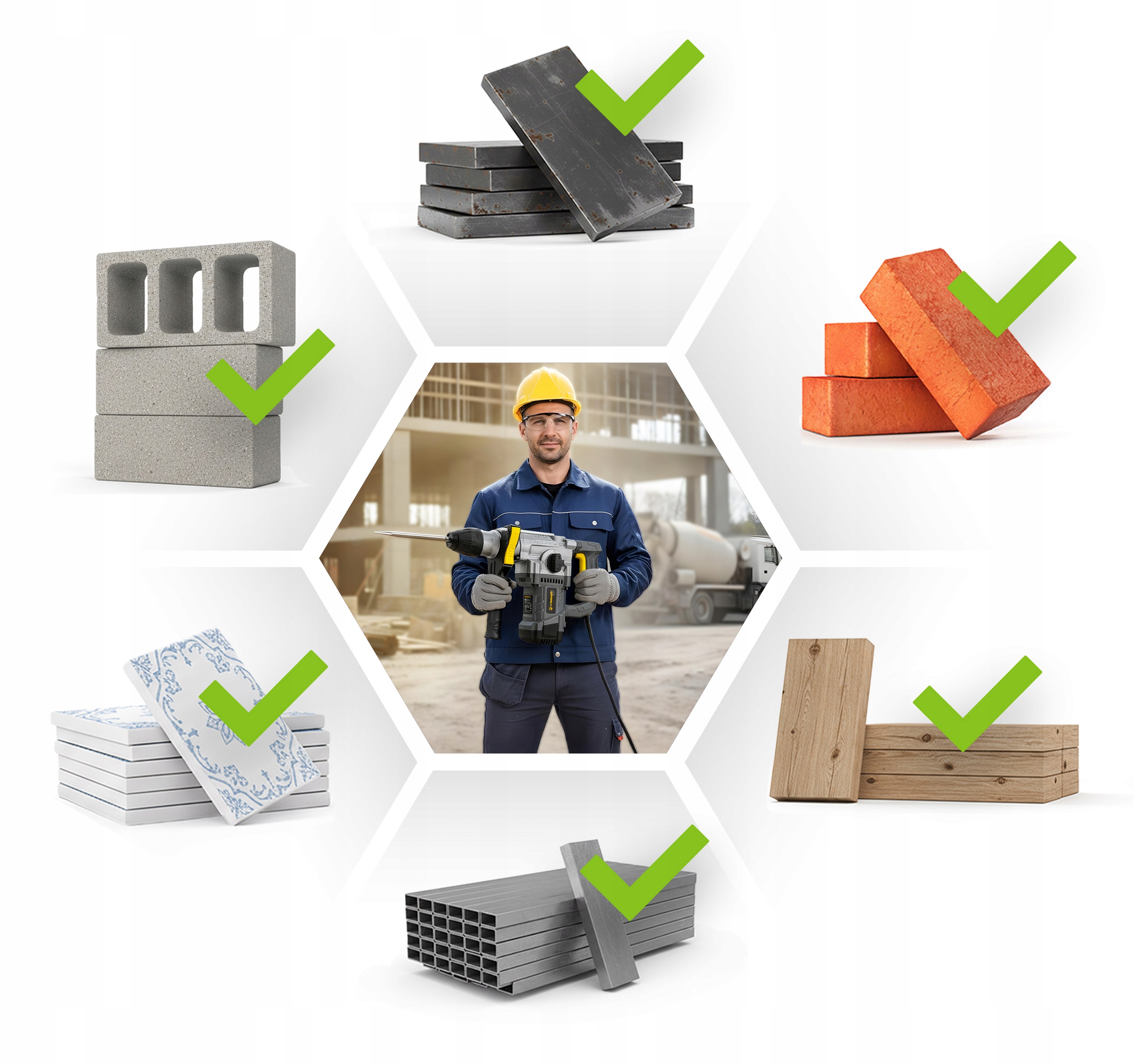 Эта ударная дрель с ограничителем глубины являетсяидеальным инструментом для точного сверления бетона, каменной кладки, дерева и металла. Упор позволяет установить точную глубину сверления, что делает работу быстрой, точной и повторяемой – независимо от типа задачи.