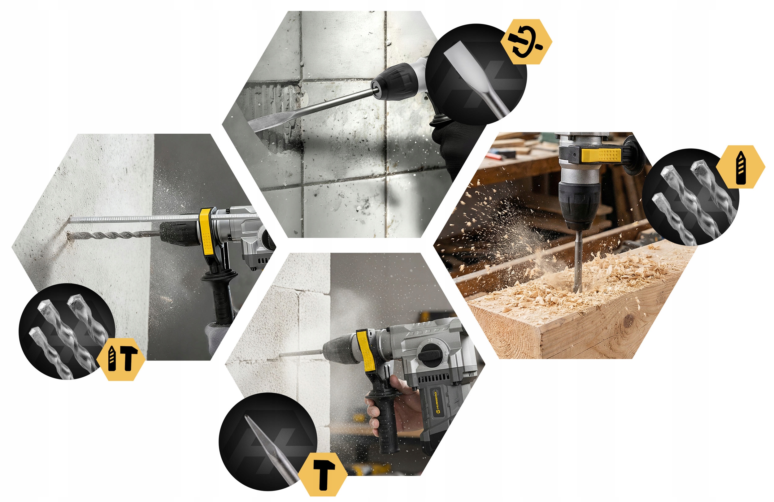 ✅ Ударная дрель ✅ 3 сверла SDS PLUS: 8/10/12 × 150 мм ✅ 2 долота SDS PLUS: острое и плоское 14 × 230 мм ✅ Дополнительная регулируемая ручка ✅ Техническая смазка ✅ Пылезащитный чехол ✅ Индикатор глубины сверления ✅ Сервисный ключ