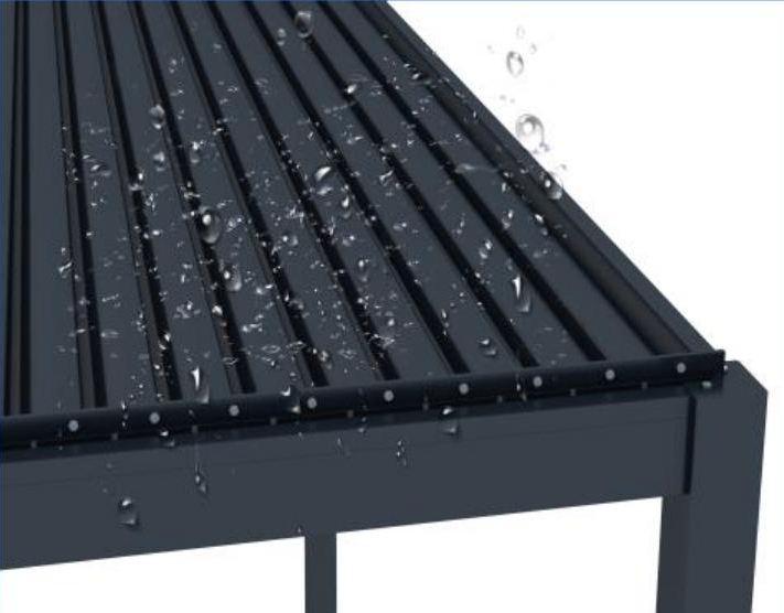 Покрытие крыши выполнено из алюминиевых жалюзи (жалюзи). Крыша убирается с помощью рукоятки, расположенной на раме, а это означает, что ее можно свободно регулировать, выдвигать или убирать в любом направлении.