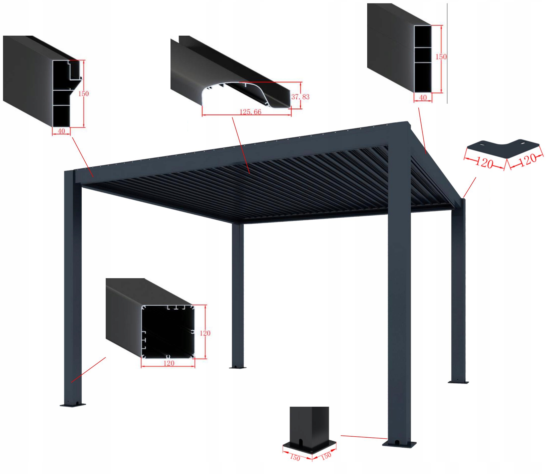 Покрытие крыши выполнено из алюминиевых жалюзи (жалюзи). Крыша убирается с помощью рукоятки, расположенной на раме, а это означает, что ее можно свободно регулировать, выдвигать или убирать в любом направлении.