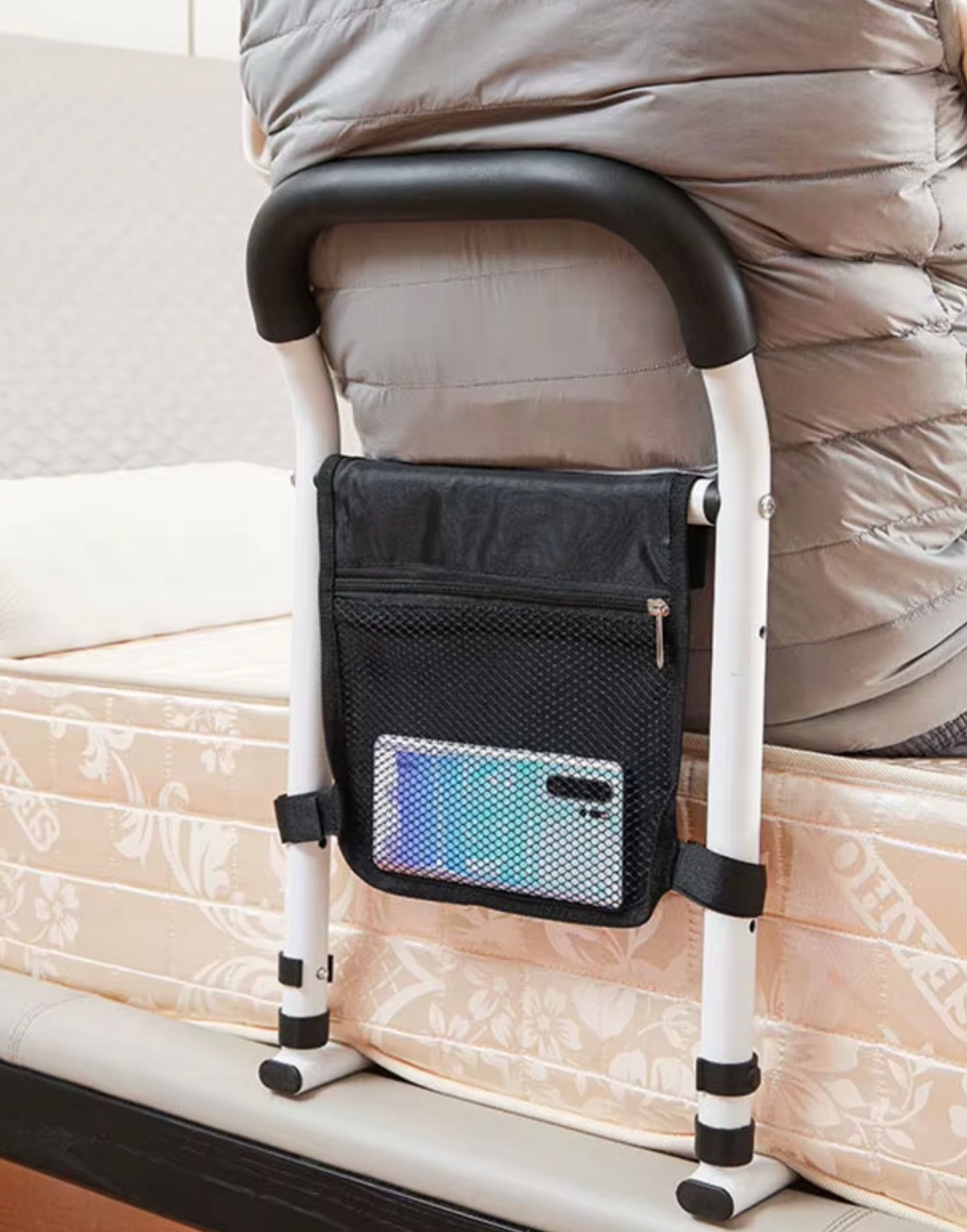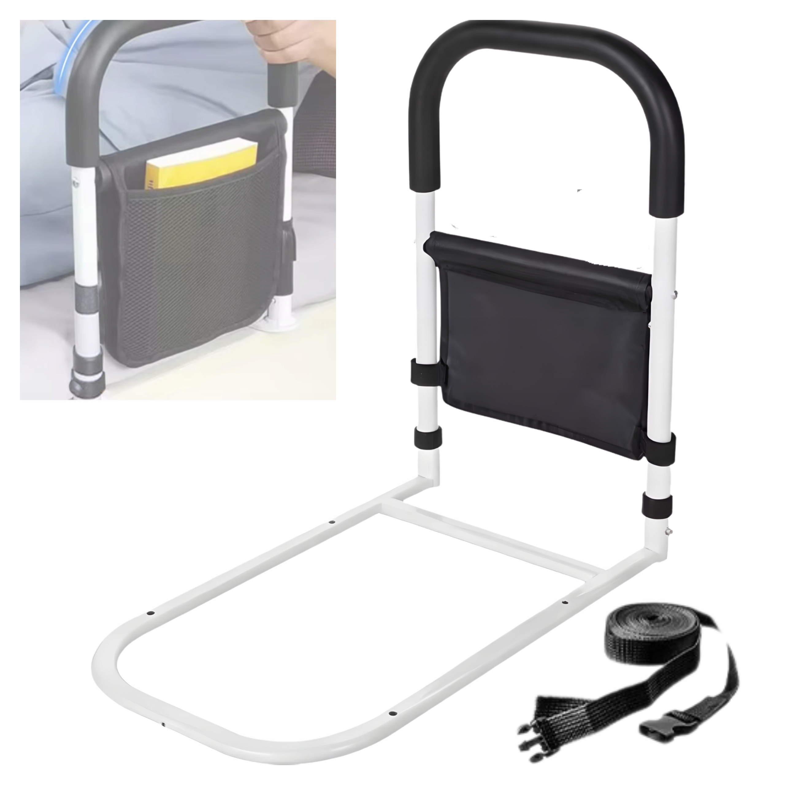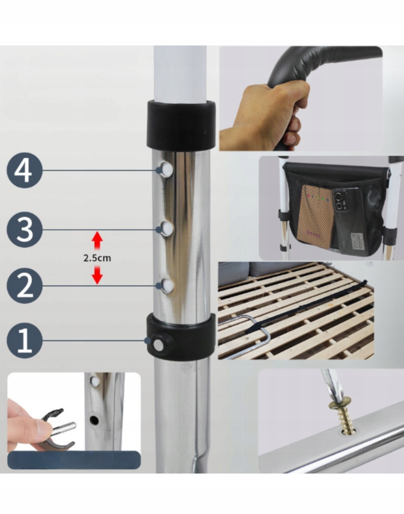 Поручень кровати разработан для стабильности, простоты установки и универсальности использования. Регулируемая высота деталей позволяет изделию подходить к большинству кроватей, обеспечивая надежную поддержку при вставании или смене положения. В комплект входит монтажный ремень длиной 3,5 метра с защелкой, позволяющий дополнительно прикрепить конструкцию к каркасу кровати, повышая безопасность использования. Все сделано из стали с порошковым покрытием, что гарантирует долговечность и устойчивость к деформации, а ручка покрыта противоскользящей пеной, что делает хват надежным и удобным. Практичный сетчатый карман спереди облегчает хранение мелких предметов, таких как пульт дистанционного управления, очки или телефон, что повышает комфорт повседневного использования.