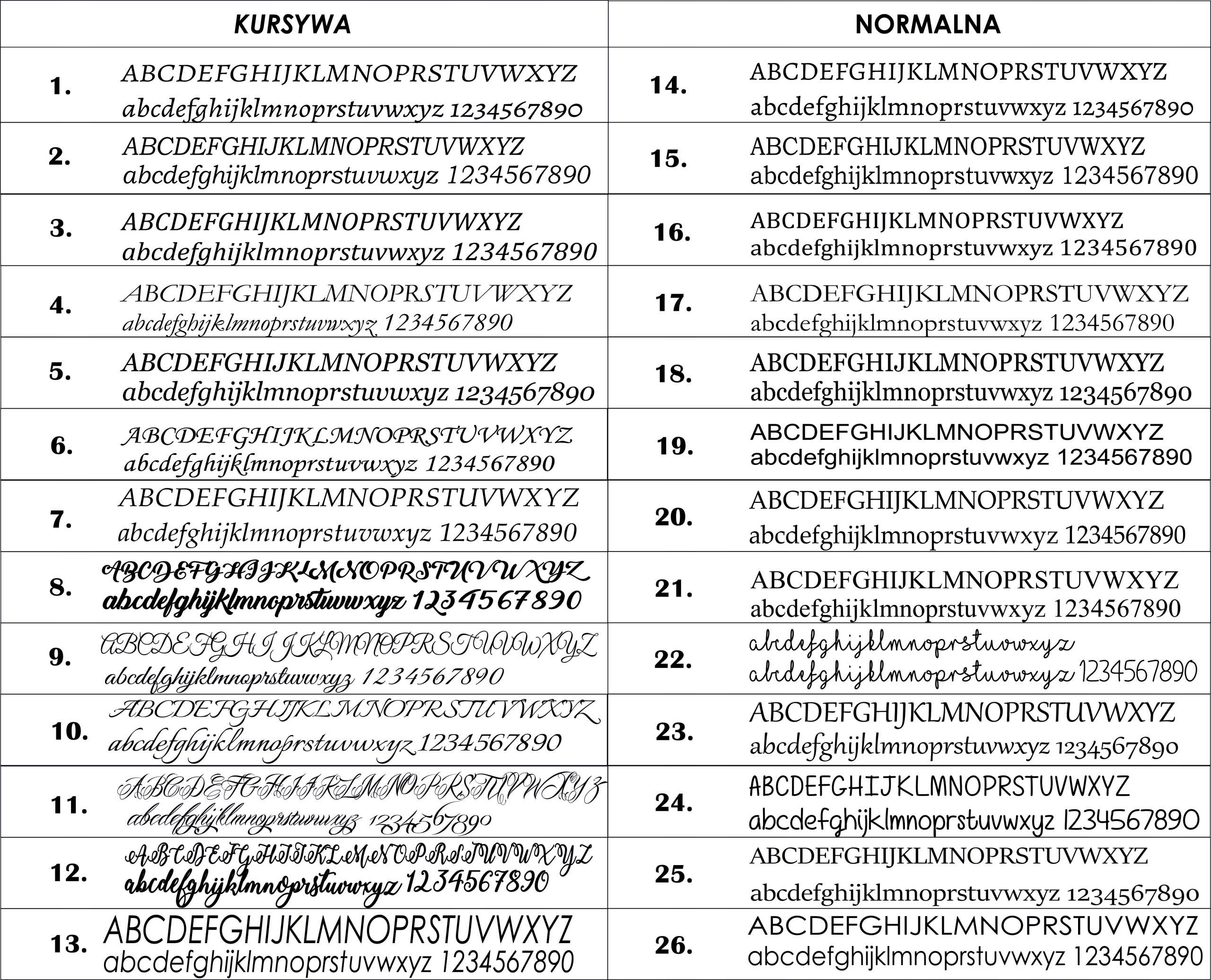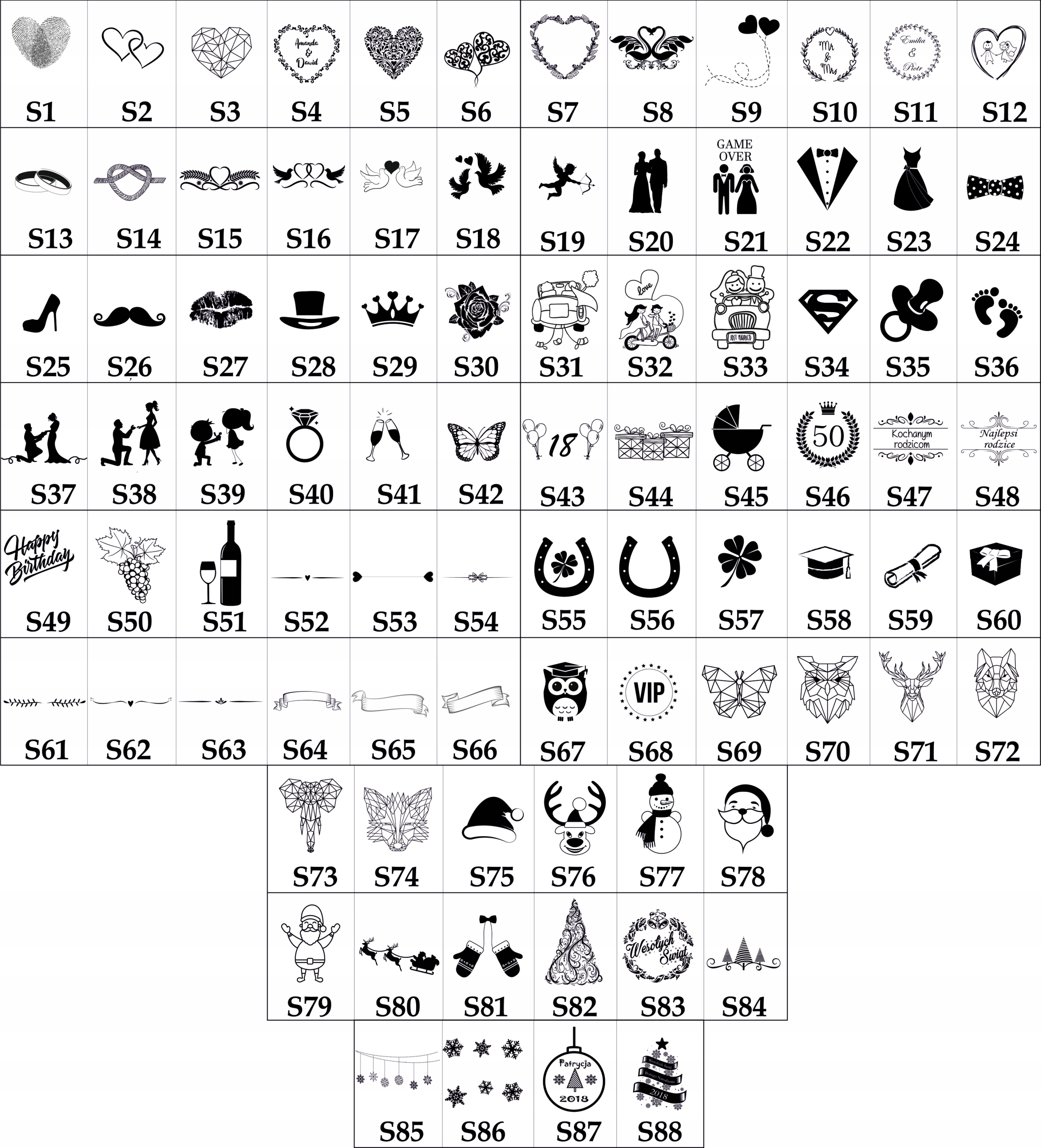 Ниже представлен большой выбор символов, которые мы можем выгравировать и разместить на наклейке, а также выбор шрифта для гравировки пожеланий, посвящений или надписей.