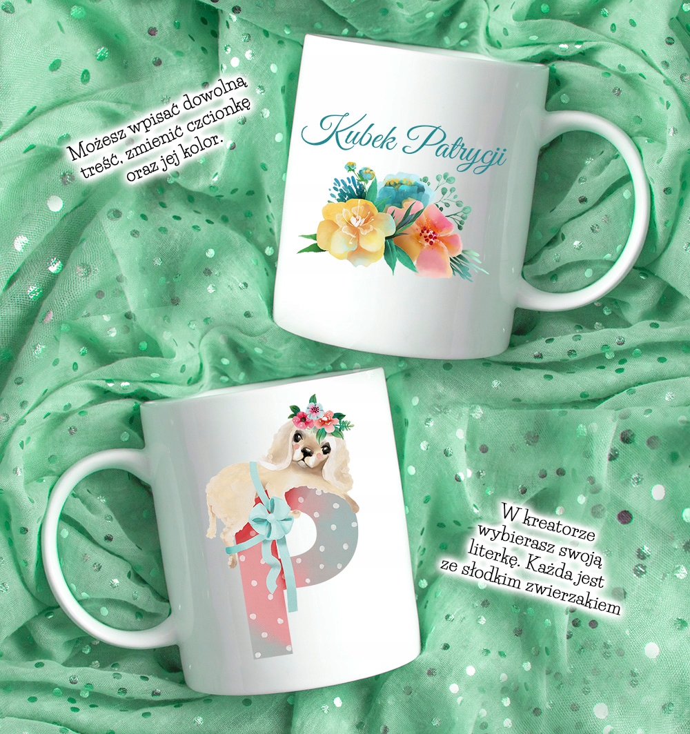 Создатель предлагает готовые шаблоны кружек, которые вы можете свободно сопоставлять и персонализировать, выбирая декоративную букву алфавита и вводя собственные тексты и имена. Ниже мы представляем образцы шаблонов печати от создателя и фотографии готовых изделий. Каждый из них доступен в создателе