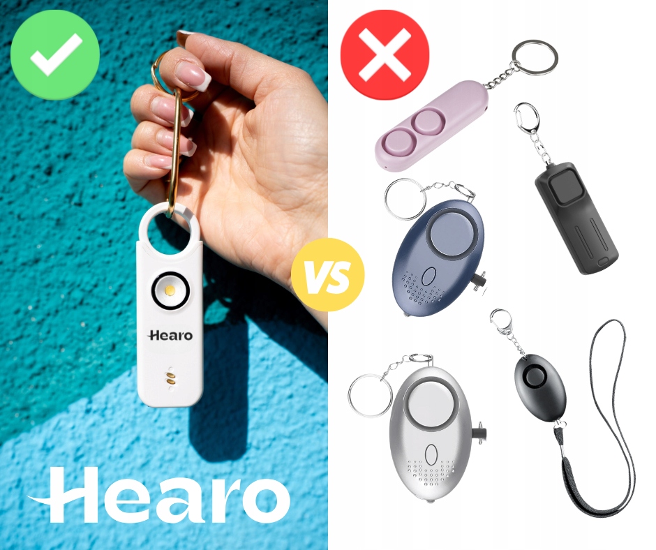 ❌ Громкость: Hearo издает сигнал громкостью 135 децибел, слышимый на расстоянии до 500 метров. Более дешевые сигналы тревоги часто недостаточно громкие, чтобы эффективно привлечь внимание окружающих в чрезвычайной ситуации.