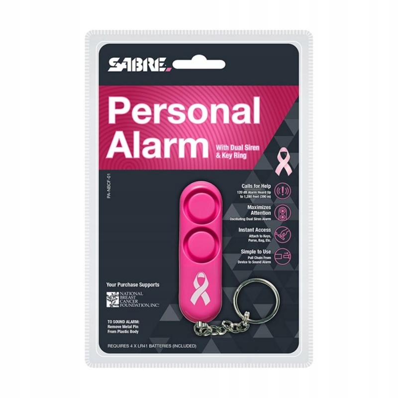 Персональный сигнализатор SABER PA-NBCF-02 Розовый брелок — Этот небольшой сигнализатор с кольцом для ключей при необходимости запускает очень громкий сигнал (120 дБ) после удаления английской булавки. Будильник отключается после повторной установки булавки.
