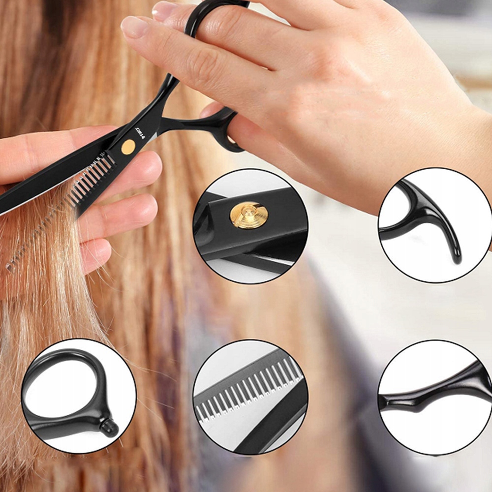 Ножницы изготовлены из высококачественной нержавеющей стали, обеспечивая длительную прочность, резкость и сопротивление факторам окружающей среды, такими как влажность или высокие температуры. Благодаря этому волосы могут быть идеально подстрижены, не опасаясь механического повреждения или риска разделения. Ножницы оснащены винтом, который позволяет отрегулировать провал ножниц в соответствии с требованием, чтобы легко получить желаемый эффект