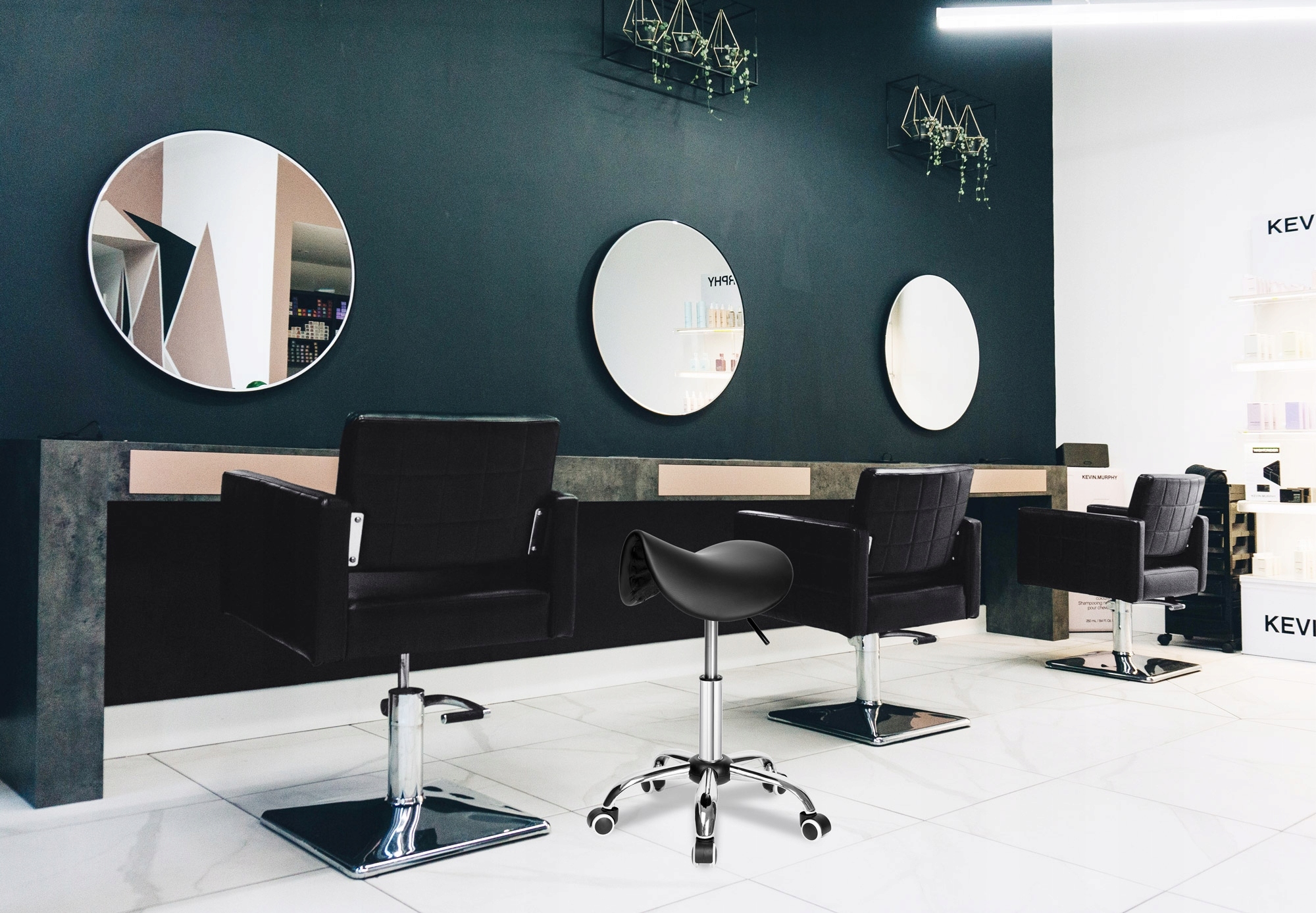 ПЕРУКАРСЬКИЙ ТАБУРЕТ ЧОРНИЙ, ОБРАТНИЙ, НА КОЛЕСЦЯХ