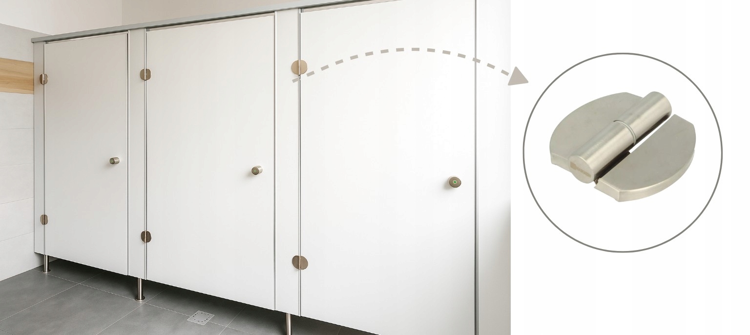 Фурнитура для сантехнических построек - комплексное решение для строительства туалетных кабин, санитарных зданий, перегородок или сантехнические перегородки из мебельного щита или стены HPL. Они будут использоваться в общественных зданиях, таких как детские сады, школы, торговые центры, спортивные комплексы и аэропорты.