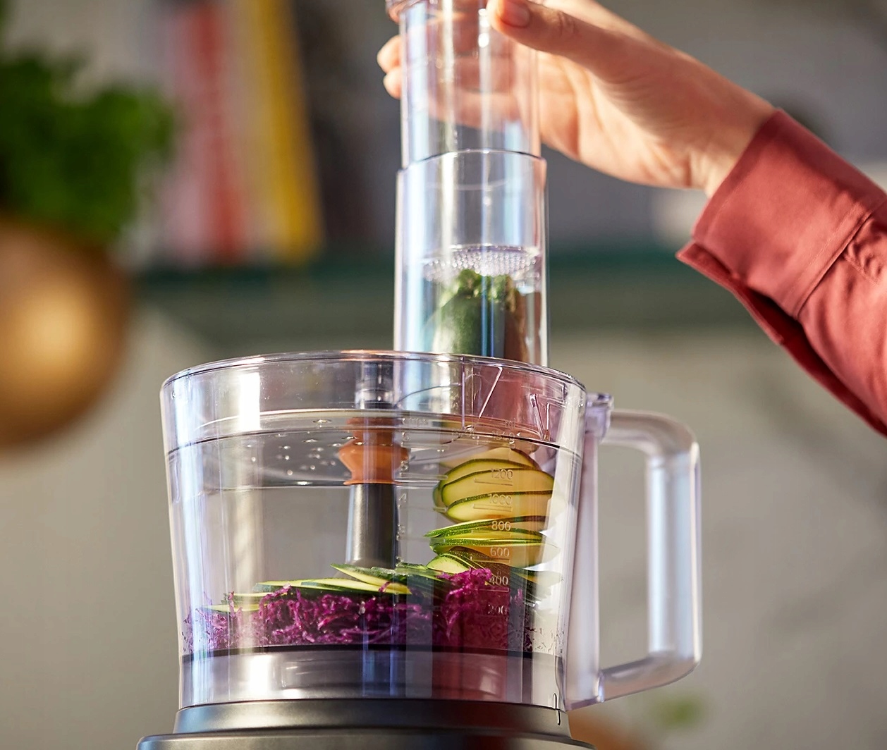Благодаря большому отверстию для продуктов, вам не нужно разрезать их на куски раньше. Благодаря более 19 функциям у вас есть неограниченные возможности: вы будете готовить еду, хлеб, соусы и не только . Используйте высококачественные многофункциональные аксессуары, чтобы нарезать, раздавить его и измельчить ингредиенты с помощью лезвия "S" или разрезать и нарезать, используя щит 2 в 1. Приготовьте то, что вам кажется - бить, замесить и не только.
