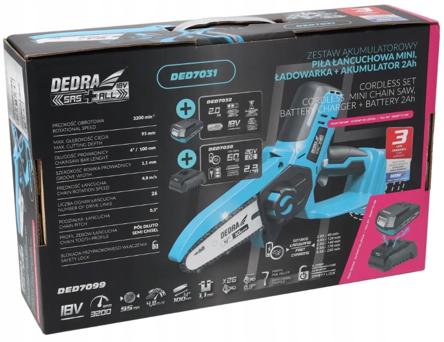 PIŁA ŁAŃCUCHOWA DEDRA SAS+ALL akumulatorowa PILARKA 2Ah 4" Mini Gałęziówka