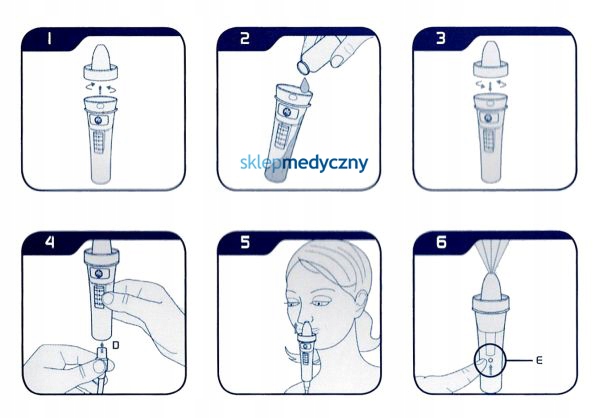 1. снять носовой колпачок, достать синий контейнер 2. залить физиологический раствор (максимум 8 мл) 3. вставить синий контейнер, надеть носовой колпачок 4. подсоединить трубку от поршневого ингалятора и запустить компрессор 5. подвести носовой колпачок контейнер к носу 6. начните промывание, закрыв отверстие в носу корпусом пальцевого ирригатора