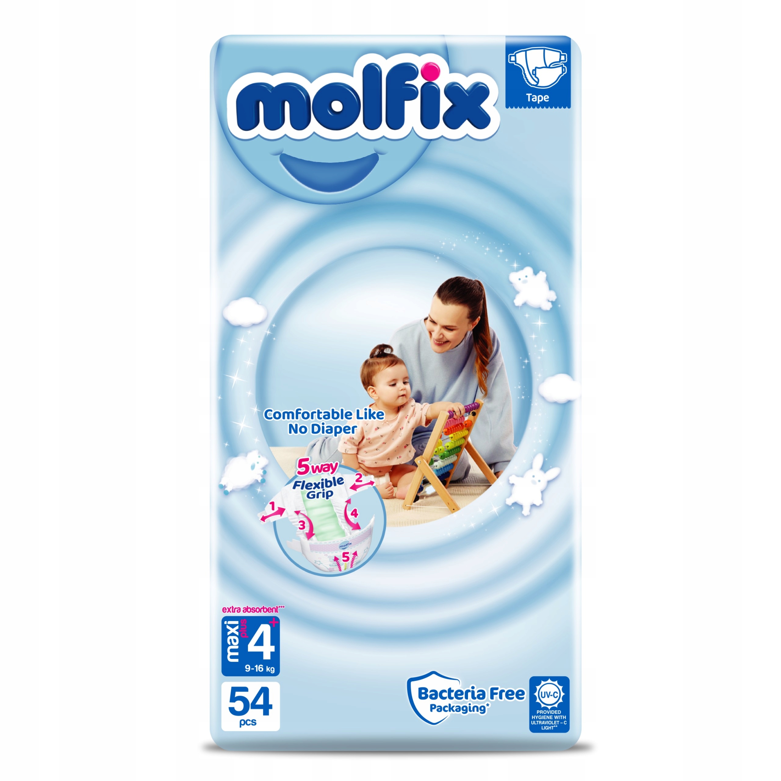 В процессе производства подгузников Molfix упаковка и подгузники стерилизуются по технологии с использованием УФ-С света*, что обеспечивает высочайшее качество гигиены.